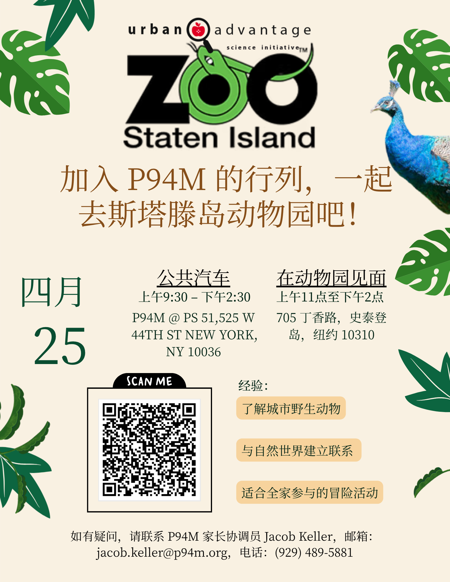 Hi Families! Please sign up to join Urban Advantage's Family Science Day at the Staten Island Zoo on April 25th. We will pick up families at P94M @ 51, 525 W 44th St, New York, NY 10036, at 9:30 AM.
